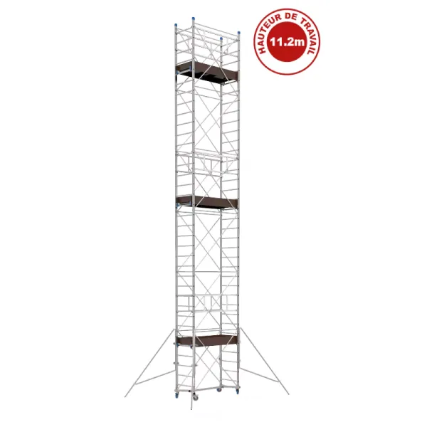 Olympo est un échafaudage roulant en Aluminium pour usage professionnel. Il est fabriqué intégralement en Italie, pouvant atteindre une hauteur de travail maximale de 11,2m. Il est normé EN1004 classe 3 et supporte une charge maximale de 200 KG. Sa plateforme de 1,80x0,75m, ses multiples garde-corps, sa base mobile solide et ses roues de 15cm font d'Olympo un modèle sécurisé et robuste. L'échafaudage peut être monté rapidement sans outils.